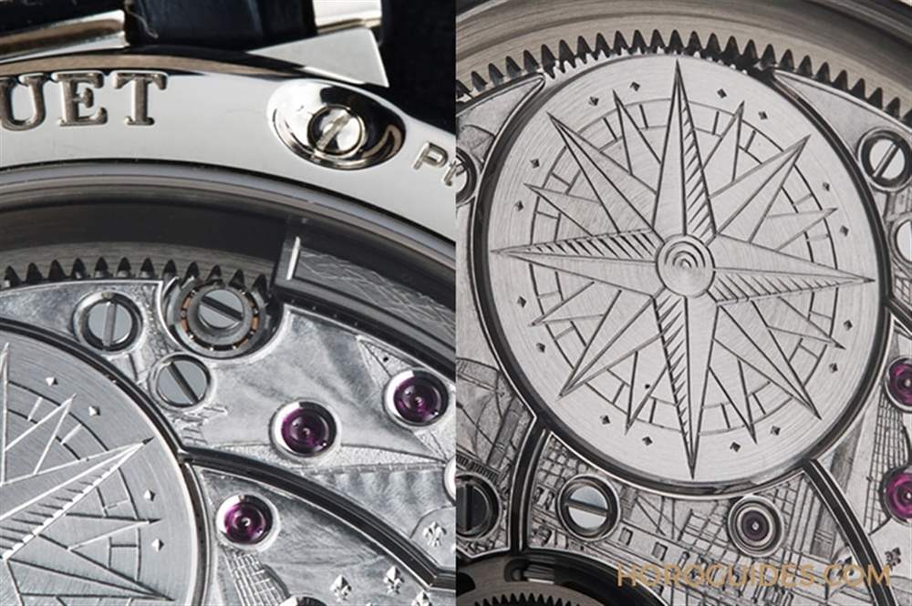發條盒蓋上雕刻的是風向玫瑰圖案的羅盤,發條盒邊緣看得到環型自動盤上鏈的輪齒。