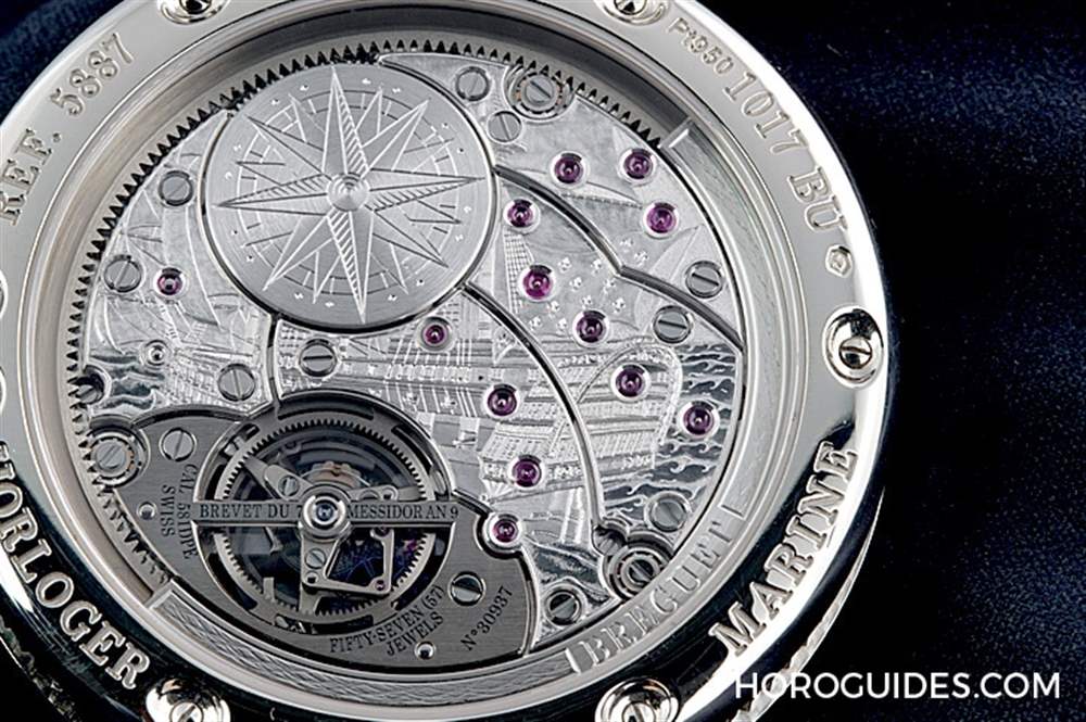 表背像手上鏈機芯一樣完整的露出機芯夾板,手工鐫刻的船艦圖案極為復雜精細。