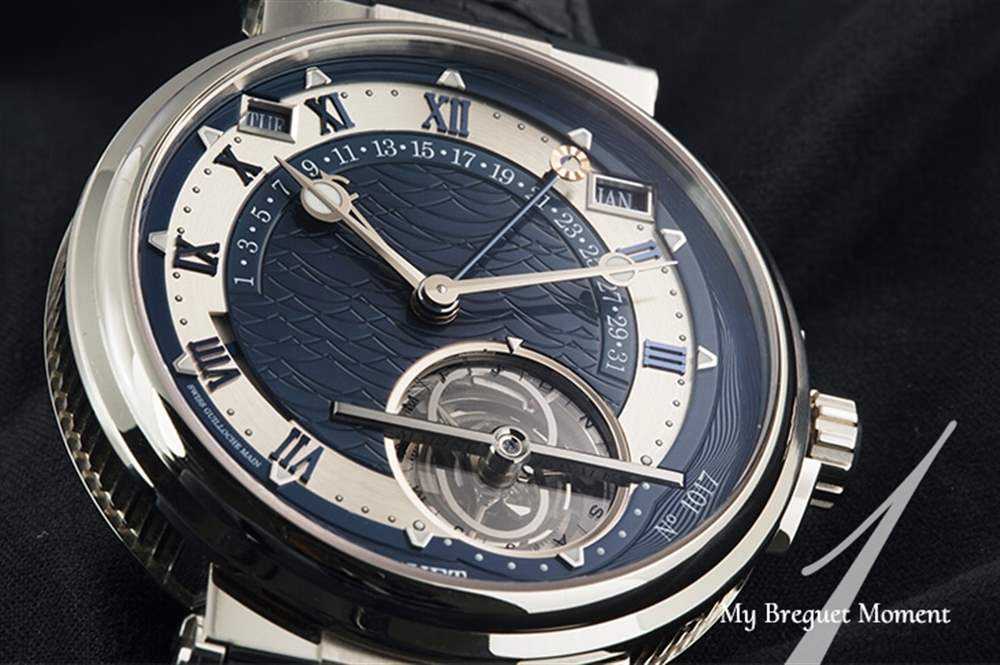 高級表重視的就是細節,每一處零件都經過精心的打磨、鐫刻,而寶璣絕對是這方面的專家。5887表盤特殊的手工鐫刻,是專門為這只表設計的波狀紋理,搭配藍色的金質表盤相當呼應表款的航海淵源。表盤上各區塊也各有不同的裝飾細節,羅馬數字時標圈是霧面拉絲打磨,表盤最外圍則還有波浪狀的雕飾。