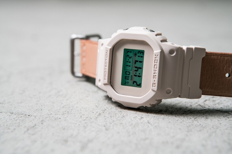 今回與Casio合作,為G-SHOCK最經(jīng)典的款式DW-5600,加入Hender Scheme擅長的真皮元素。玩過G-SHOCK的人,應(yīng)該都不會沒玩過DW-5600,本來就是一枚低調(diào)的黑色膠表,sporty味道濃。但是當(dāng)用上Hender Scheme的真皮元素加持,立即有完全不同的變化,而且將表面的大部份文字圖案拿走,連adjust、mode等字樣都放到表背,令表面更加簡約,那素肌真皮色調(diào)更加突出,令DW-5600不再只是一枚G-SHOCK。