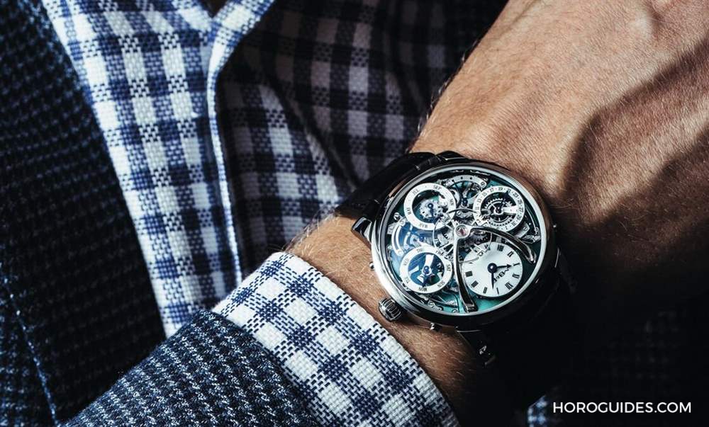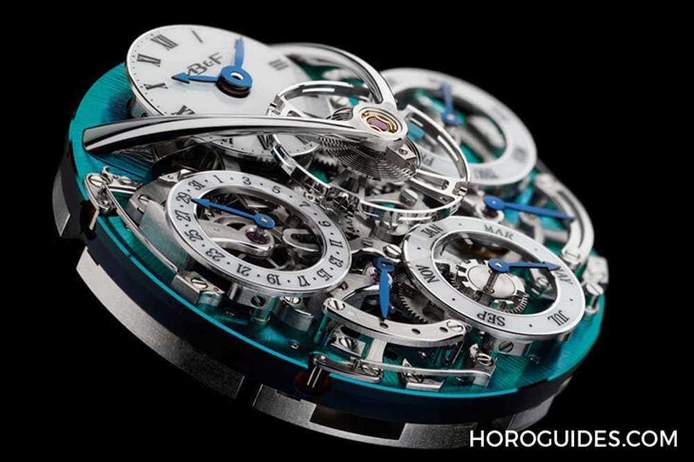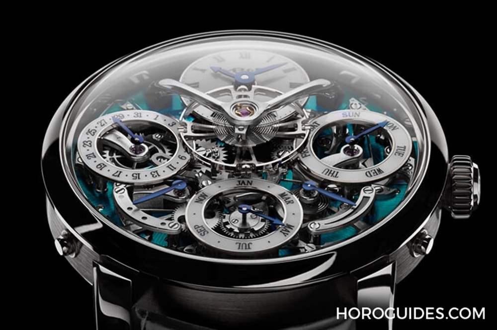 LM Perpetual專用機芯搭配革命性創新系統,零件數達581枚(一般萬年歷機芯零件數約250~300枚之間),無模組、無基礎機芯,乃是經過全新設計。鏤空的表盤呈現的是層層疊疊的顯示圓盤以及復雜的組件,尤其中央仿佛騰空飛行的擺輪組,以充滿弧度的光亮表橋支撐,看起來就像是降落在綠色原野上的太空飛船。