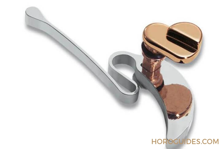 同樣是力求保持表殼形狀的流線圓滑,微凹小按鈕必須以調校針或是尖細的物品來戳按,當手中沒有相關工具時,就無法進行調整;而寶鉑的推桿隱藏式調校,撥動推桿在表殼凹槽內推動齒輪,進而連動調校機關。雖然用手指撥動小小的推桿仍然會需要一點熟練度,但至少不用限制手邊一定要有工具。