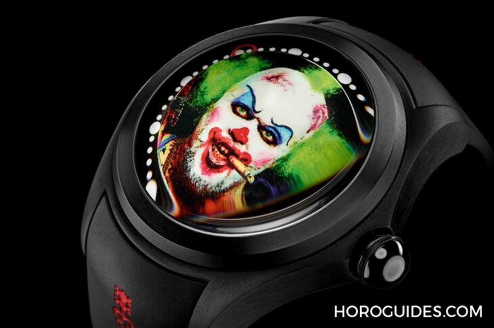 為了不遮擋到表盤上的小丑畫作以及大曲面表靜戲劇性的放大效果,Bubble Clown小丑腕表沒有指針指示時間,而是以表盤外緣上的兩個紅圈來代表小時以及分鐘。