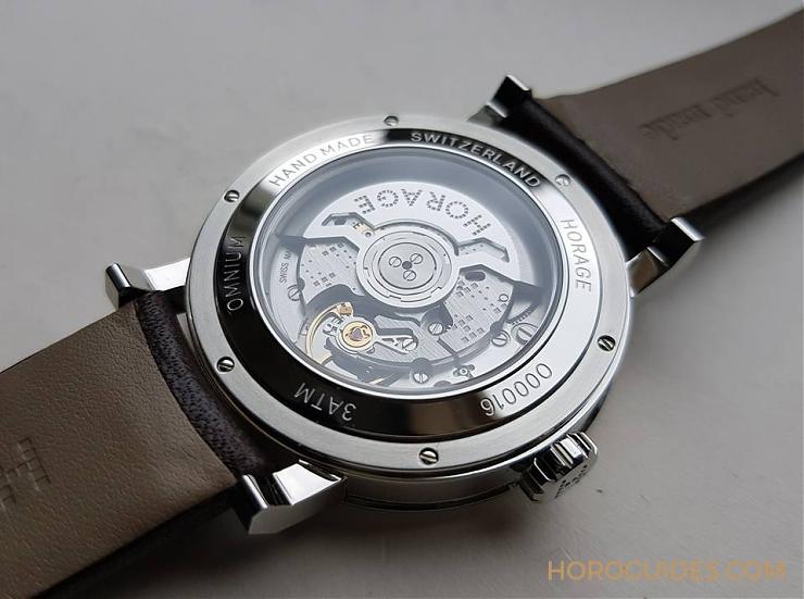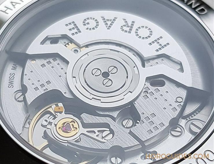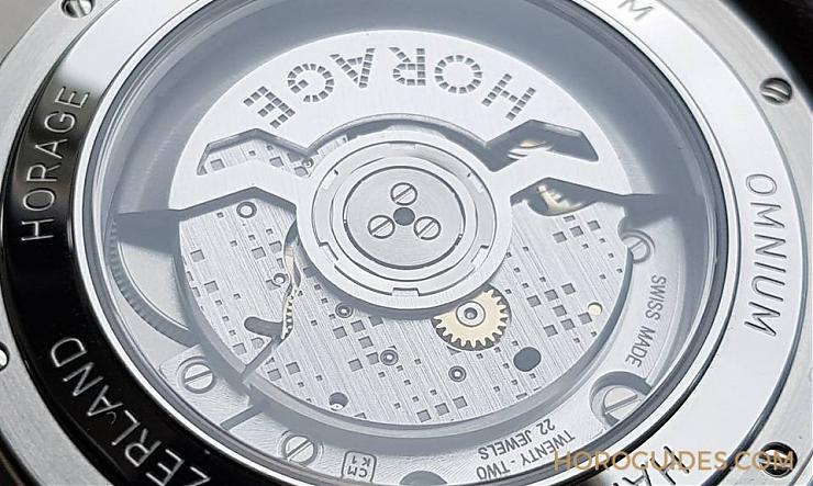 細節是評鑒手表的基本條件,從表冠的造型,表扣還有面盤Logo 皆以點狀組成,可以看出品牌的投入。點狀字是來自紐約地鐵站,類似馬賽克的排列方式,極具藝術美感。Omnium搭載自行研制的K-1機芯,橋板上依然有方格雕飾,挺特別的處理方式,有水準以上的拋磨修飾。機芯的震頻為25200 (兼顧較長的走時能量與精準),采用矽擒縱結構。經佩戴測試,每日約快2-5秒(平放約5秒)。HORAGE是手表,也是珠寶品牌,在表殼后蓋邊緣寫著:HAND MADE,可以看出手工制表的比例很高,好表。