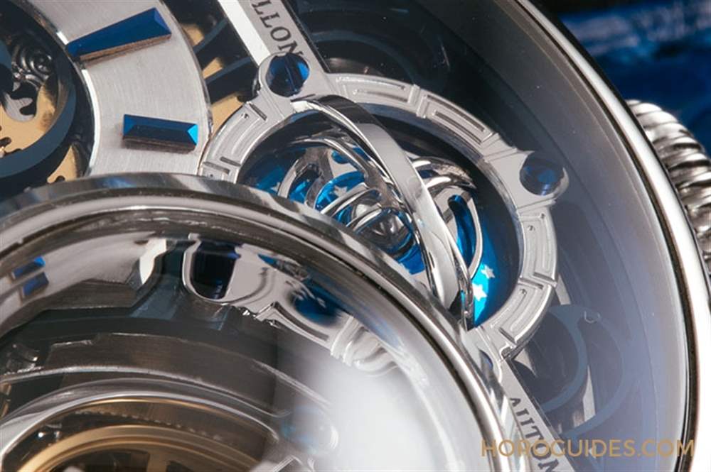 東西交融是萬希泉的一大特色,更從星恒系列尊爵版陀飛輪體現。以『天圓地方』貫串表盤設計,從3點鐘位置的陀飛輪對應著9點鐘位置的時分盤,12點鐘位置裝飾的是古代中國天文儀器渾天儀,而與6點鐘位置現代立體投影的地球儀對稱,再藉由18K金的方形框架圍繞各時間位置的組件。兩兩對稱又方正連結體現了天圓地方,宜古宜今又中西輝映的元素自成一格,再次回歸以西方的高級制表技藝體現中華文化精髓的品牌精神。