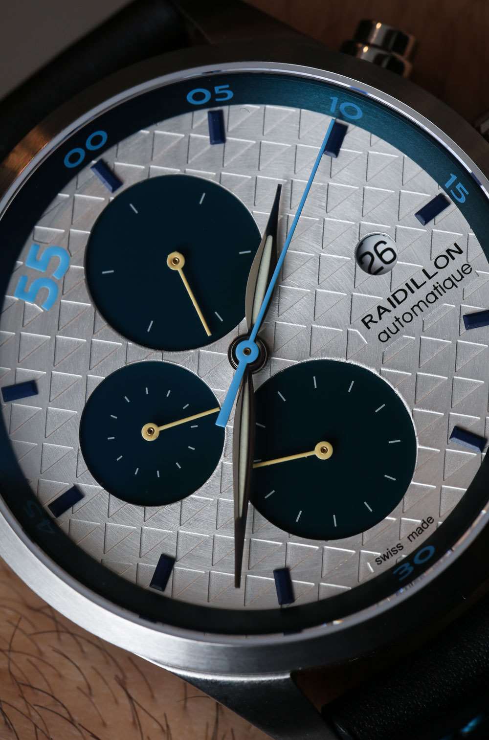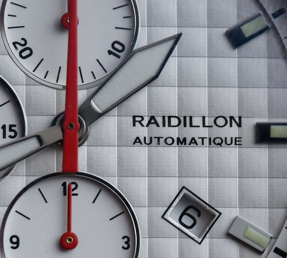 從主題上講,Raidillon 讓我想起了居住在瑞士蘇黎世的Maurice de Mauriac。這些較小的品牌中的每一個都在盡可能多地使用美觀且多功能的表殼和表盤設計。您可以看到與瑞士 ETA Valjoux 7750 自動計時碼表機芯結合使用時如何享受大量炫酷選擇。