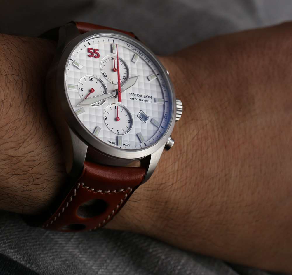 然而,根據 Raidillon 的說法,這些表帶是在比利時生產的——與手表其余大部分的制造地相比,它應該離家更近。每款 Raidillon Chronograph 手表都是限量發行 55 件的一部分,這個數字也是品牌的重要組成部分,不僅在表盤上設計得非常顯眼,而且在品牌自己的標志上。這個數字來自于 Raidillon 顯然受到啟發的某種比賽類型中的最大汽車數量。