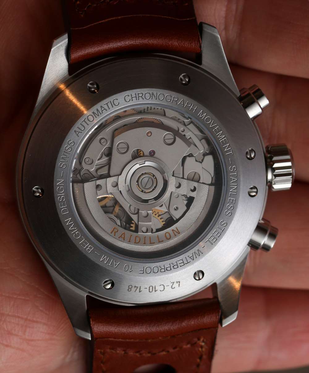 通過表殼后部,您可以通過藍寶石水晶顯示屏后蓋查看 7750 機芯,您會發現一個定制擺陀。我得到的明顯印象是,只要有錢和時間,Raidillon 就會越來越多地添加越來越多的定制部件。對于新品牌來說,這是一個非常普遍的問題——因為需要多年的投資和研究才能找到新的優秀供應商來生產更多獨特的東西,甚至開始在內部生產東西。內部制造的好處是設計靈活性和節省時間。完全依賴供應商的小品牌在等待零件進貨方面有很長的準備時間,而且通常這些零件永遠不會正確完成。知道這一點讓我想知道 Raidillon 需要多久寄回表盤之類的東西,因為工廠這里或那里的顏色有點不對。
