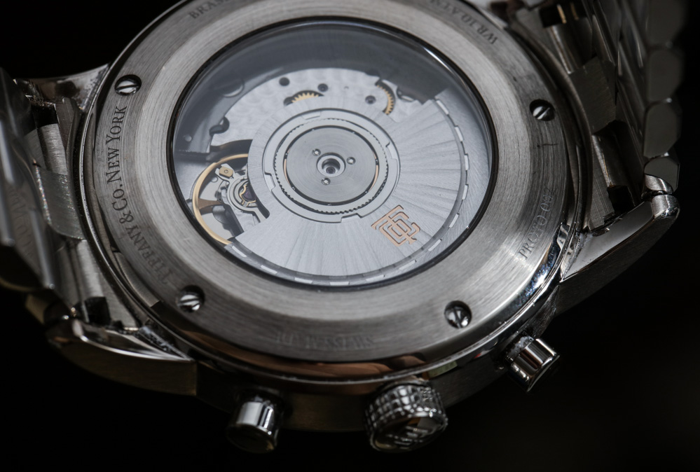通過藍寶石水晶底蓋可以看到機芯,裝飾精美。我選擇不拍攝這款特別的 Tiffany & Co. CT60 Dual Time 手表的完整照片,因為我正在檢查一個外觀不準確的預生產原型。藍色表盤極具吸引力,有助于為這個莊嚴而保守的系列增添特色,但為了在閱讀時間和雙時指示 GMT 指針時獲得最大的易讀性,可能值得看看“白色太陽”銀色表盤版本也非常帥氣。在這只表上,格林威治標準時間指針的箭頭是藍色的,與同樣是藍色的表面有些融合。
