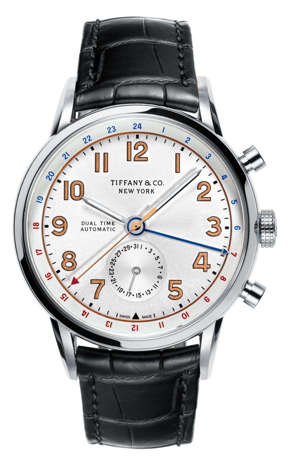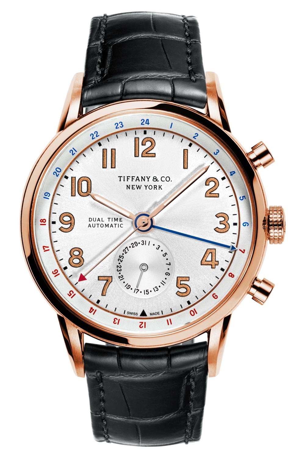 Tiffany & Co. CT60 Dual Time 寬 40 毫米(防水深度達 100 米),特意制作為中等尺寸的腕表,直徑與三針型號相同。計時碼表稍大一些,寬度為 42 毫米。Tiffany & Co. CT60 Dual Time 進一步推出兩款精鋼款和 18k 玫瑰金款。精鋼型號是這款參考號 36813903,配備“太陽藍”表盤和鋼質表鏈,以及參考號 36813881,配備銀色表盤和黑色鱷魚皮表帶。Tiffany & Co. CT60 Dual Time 型號 36813911 配備 18k 玫瑰金表盤和黑色鱷魚皮表帶。廣告留言廣告信息結束