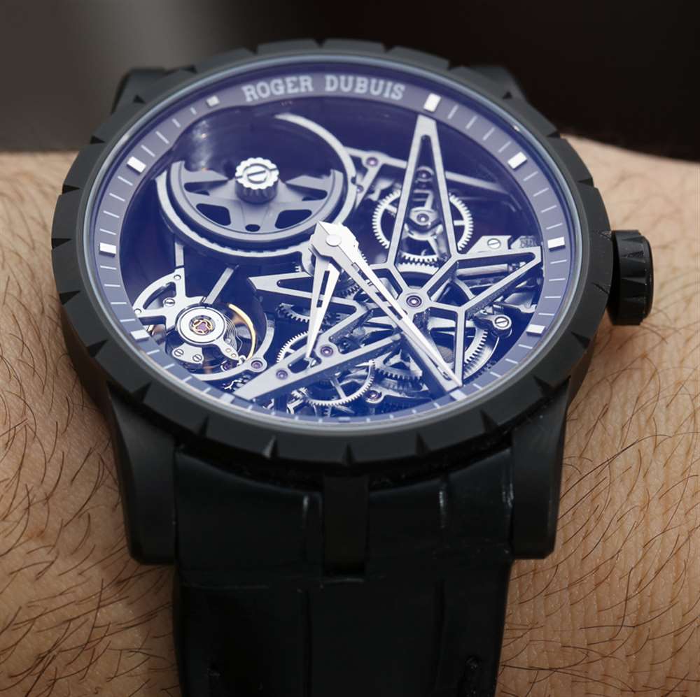 42 毫米寬的羅杰杜彼 Excalibur 42 鏤空自動上鏈腕表已經(jīng)比該系列中采用 45 毫米寬表殼的許多較大型成員感覺舒適得多。例如,如果您購買了帶有雙陀飛輪的 Excalibur,那么這個尺寸就是您在手腕上找到的尺寸。即使是那些也不是不能戴,但 42 毫米寬的 Excalibur 實際上戴起來并不小,而是在手腕上有一個非常“宏偉的外觀”。