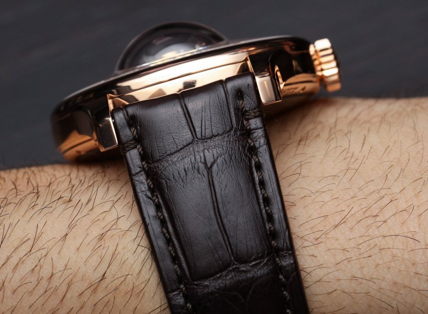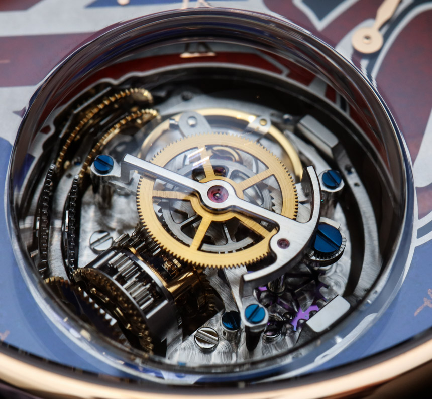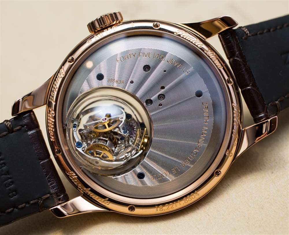 18k 玫瑰金表殼寬 45 毫米,表殼厚 14.35 毫米,但在安裝“零重力”調節系統的藍寶石水晶“氣泡”處厚度達到 21.4 毫米。這個概念很有趣,玩起來很有趣。你擁有的是一個高度復雜的球形調節系統,由設計在萬向架上的擺輪和擒縱機構組成。從底部開始加重,其理念是無論您將手表朝哪個方向移動,調節機構都保持直立。從理論上講,這是為了提高準確性。戴上手表,轉動手腕,玩起來也很有趣……廣告留言廣告信息結束