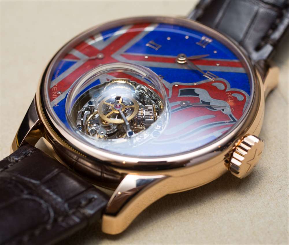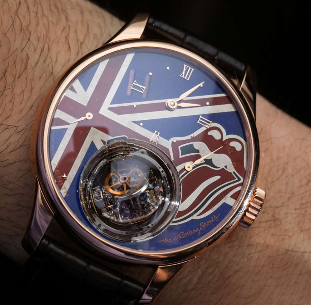 帶有滾石樂隊的標志、張開嘴巴的標志和英國國旗,每個表盤都是手工琺瑯,在指針和索引標記上涂有金色貼花。如果您真的很喜歡滾石樂隊,那肯定是一個很酷的概念。