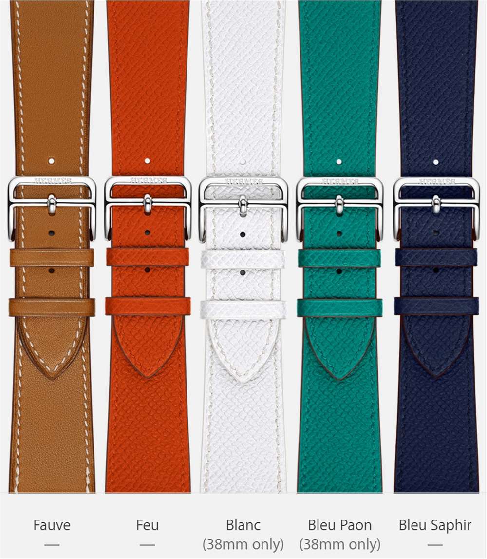 Apple Watch Hermes 表帶共有三個版本,包括 Single Tour(38 毫米和 42 毫米版本)、Double Tour(僅限 38 毫米)和 Cuff(僅限 42 毫米)。所有愛馬仕原版表帶顏色版本以及新顏色都可以單獨購買,它們包括 Fauve Barenia(棕褐色)、Noir(黑色)、Capucine(紅色)、Bleu Jean(淺藍色)、Etain(灰色)、Blanc(白色)和 Feu(橙色)。Apple Watch 的三種不同愛馬仕表帶共有七種顏色可供選擇。