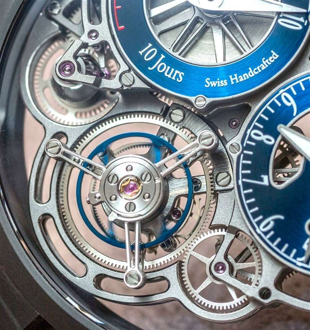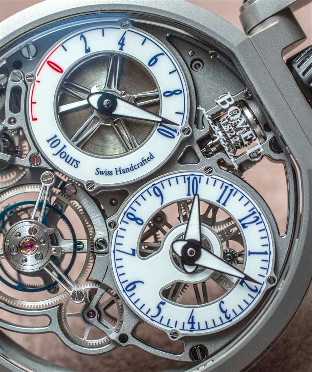 Bovet Pininfarina OttantaSei 10-Day Tourbillon 內部是一款名為 17BM03MM 機芯的新機芯。手動上鏈,機芯以每小時 18,000 次(2.5 赫茲)的速度運轉,并在一個發(fā)條盒中提供長達 10 天的動力儲存。查看和操作機芯是真正的美。Bovet 決定通過在輔助表盤、大直徑陀飛輪(兼作小秒針指示器)和動力儲存指示器上提供時間,使事情盡可能簡單和優(yōu)雅。廣告留言廣告信息結束