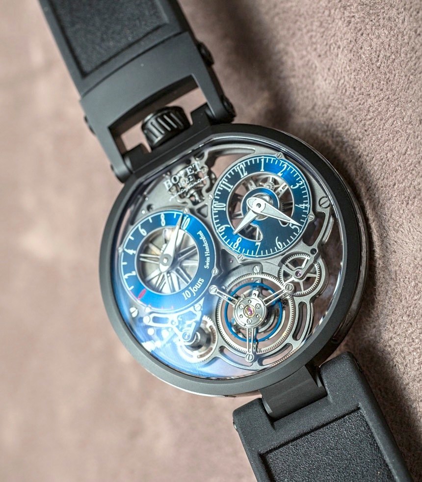 Bovet Pininfarina OttantaSei 10-Day Tourbillon 手表也很輕——尤其是兩個鈦金屬版本。我必須承認,考慮到 12 點鐘位置的“蝴蝶結式”表冠位置,它佩戴起來非常時尚,但并不不舒服。Bovet 聲稱即使是黃金表殼也僅重 51.66 克(不含表帶)。整個設計的重點是讓 Bovet Pininfarina OttantaSei 10 天陀飛輪看起來輕盈……輕盈。