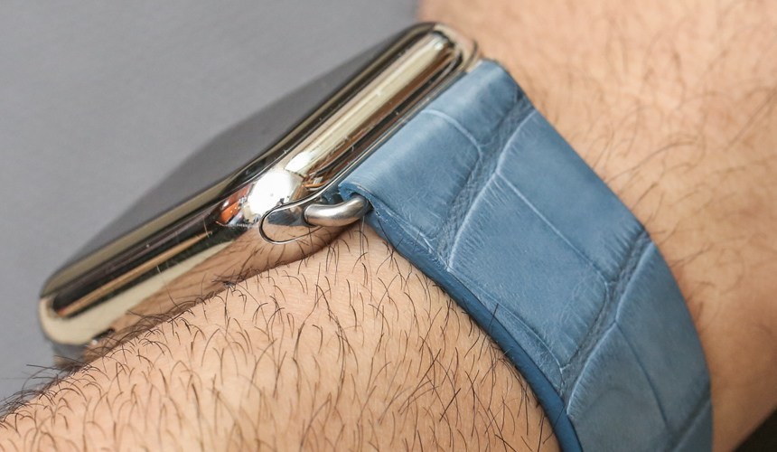 Bianca Mosca Apple Watch表帶目前有 10 種顏色可供 42 毫米和 38 毫米 Apple Watch 使用,搭配精鋼、黃金色調(diào)或玫瑰金色金屬配件。這是“Blue Jeans”彩色鱷魚皮表帶,據(jù) Bianca Mosca 稱,他們所有的 Apple Watch 表帶都是在法國生產(chǎn)的。