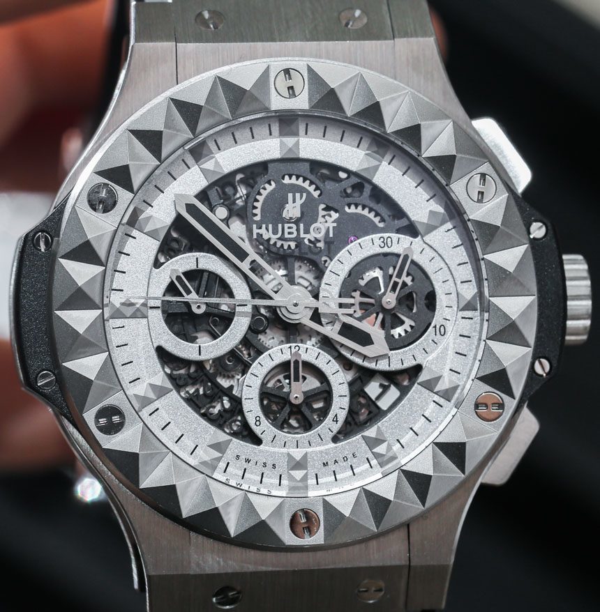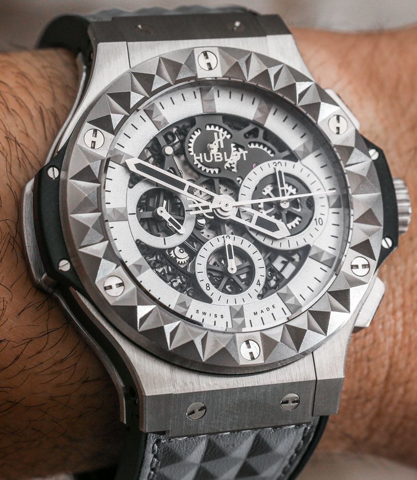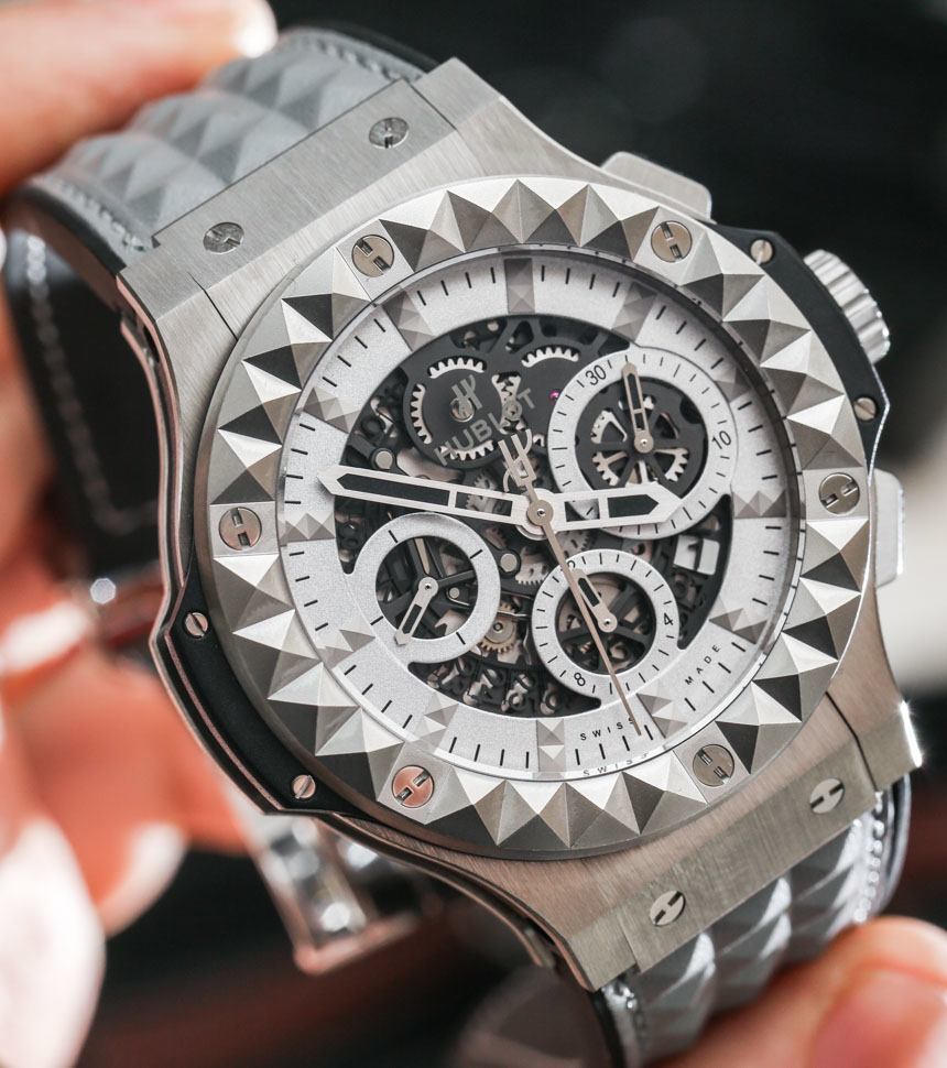 這是Big Bang“Aero Bang”的原因是部分鏤空表盤。Aero Bangs 就是采用這種表盤樣式的 Big Bang 手表。它的外觀很有趣,與標準的 Hublot Big Bang 相比并沒有好壞之分,但確實提供了一些獨特的造型和有趣的細節。所以我的問題是,如果你喜歡 Big Bang,你是否也喜歡這個有趣的 Depeche Mode 模型?或者,如果您不喜歡標準的 Big Bang,表帶和表圈上的金字塔式“Clos du Paris”圖案是否給了您對整體手表設計感興趣的新理由?