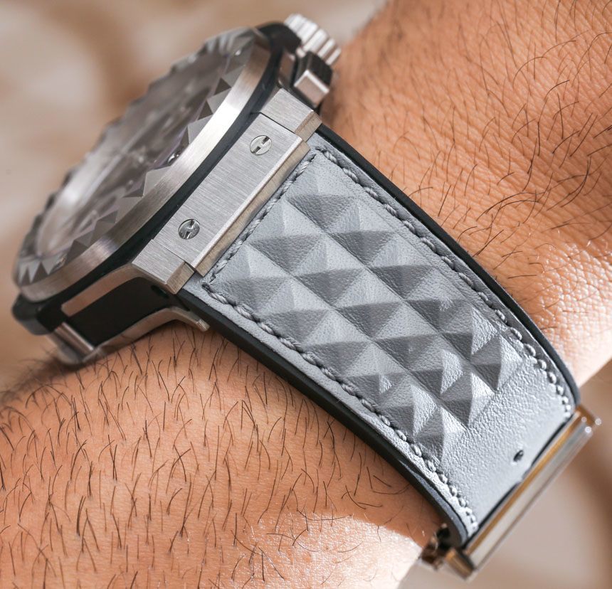 銀色表帶對我來說真的很有趣,因為你真的看不到有這樣紋理/圖案的皮革。據宇舶表介紹,帶有“Clous Pyramide”裝飾的表帶上部為經過“熱成型”處理的灰色小牛皮。對于一些收藏家來說,這款鋼表帶或現有的黑色陶瓷 Hublot Big Bang Depeche Mode 手表可能值得。皮革下面是黑色橡膠襯里。