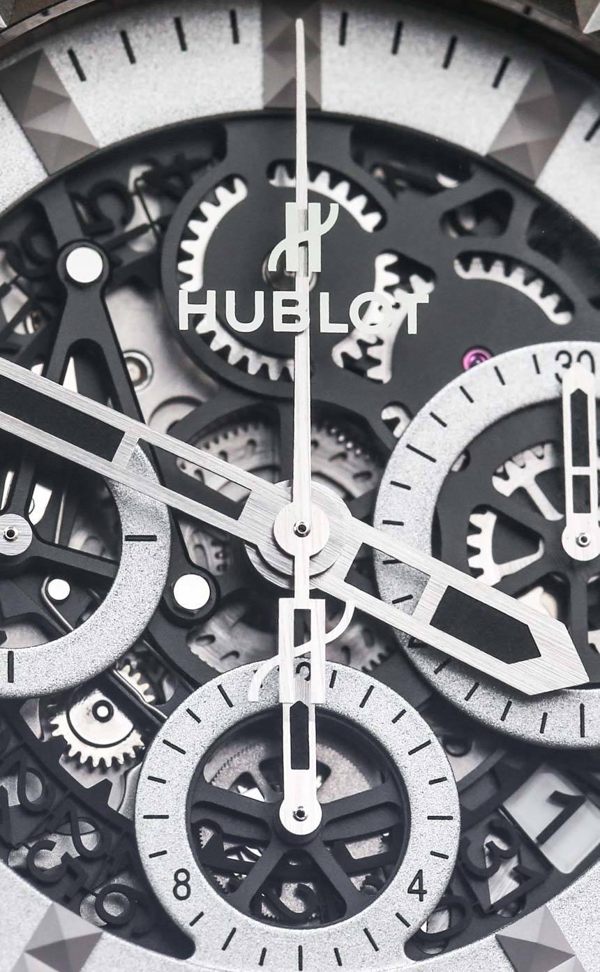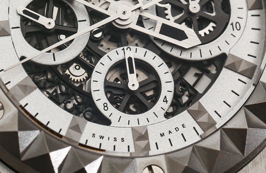 宇舶 (Hublot) 設法在手表的另一個地方添加了金字塔圖案,那就是小時刻度——我覺得這很酷。這當然是一個巧妙的接觸。與黑色陶瓷 Hublot Aero Bang Depeche Mode 不同,精鋼版的表盤非常突出且清晰易讀。啞光表面提供出色的對比度和易讀性。表面大多經過“微噴砂處理”(噴砂處理),其中大部分鍍銠。時標經過緞面處理,指針帶有黑色 SuperLumiNova 夜光涂層。不要讓整個手表的奇特之處分散您對一些炫酷表盤裝飾元素的注意力。