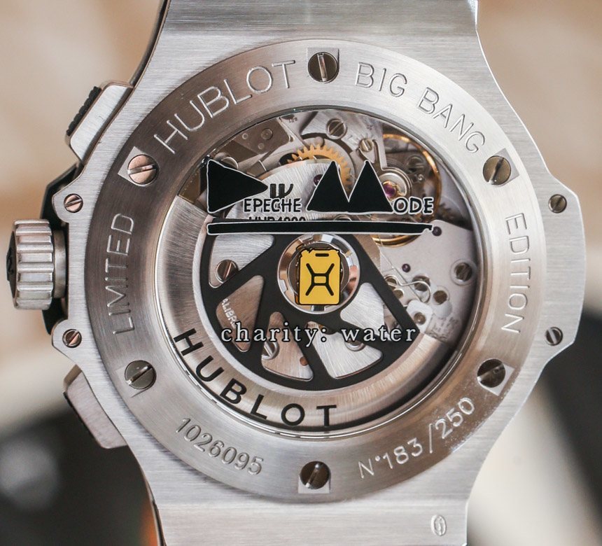 Hublot Big Bang Depeche Mode Steel 手表內部是 Hublot 口徑 HUB4212,它是經過改進的瑞士制造自動計時碼表。您可以通過藍寶石水晶底蓋窗口看到機芯,底蓋還帶有 Charity: Water 和 Depeche Mode 標志。我認為下一款 Depeche Mode 手表(如果有的話)基于更新的Hublot Big Bang Unico 45mm 手表會很有趣。