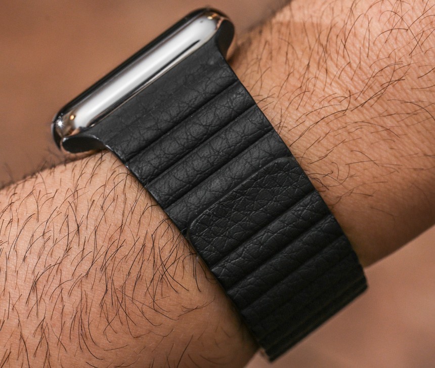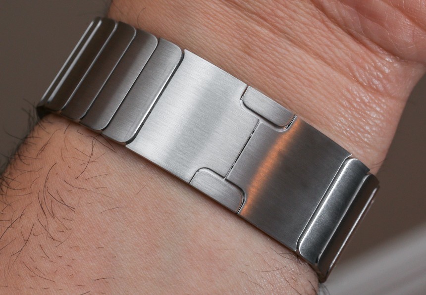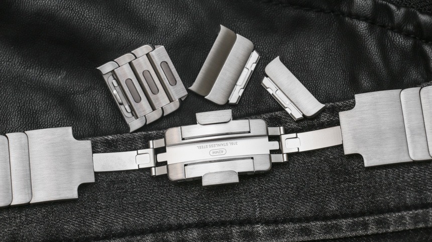 如果您選擇精美的“Link Bracelet”,您會發現很多很棒的細節,首先是它的尺寸很容易調整。不需要任何工具,這個過程既直觀又精致,因為您只需按下每個鏈接后面的小按鈕即可釋放它們。手鐲有一個蝴蝶式展開扣,設計巧妙,幾乎與手鐲的其余部分齊平。這讓我想起了舊的勞力士手鐲——在一些型號上,比如潛航者,它有厚而丑的展開部分(謝天謝地,他們設計出來了)——考慮到蘋果公司恰恰相反,他們的解決方案非常薄。