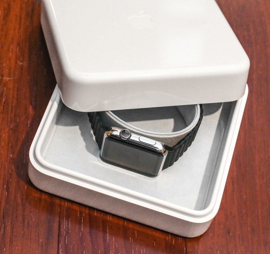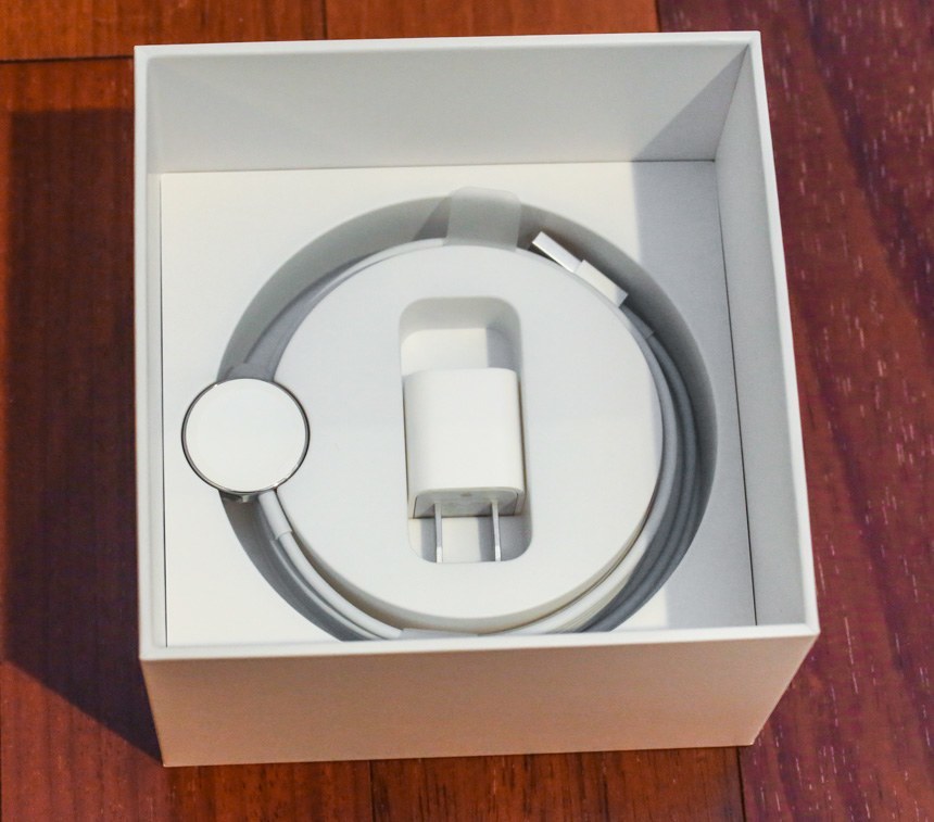 任何熟悉購買手表的人都會立即認出 Apple Watch 盒子看起來非常像傳統的手表盒子。Apple 并不注重節省空間,而是注重使用不會被丟棄的包裝材料提供真正的“優質”體驗。擁有 Apple 筆記本電腦的人會發現盒子的形狀很熟悉,因為它與 Apple 為其 MacBook Air 和 MacBook Pro 筆記本電腦附帶的充電器非常相似。Apple Watch 包裝盒包含一個可用作儲物盒或旅行箱的塑料內盒、一個小袋子(當您調整鋼表鏈尺寸時可放置額外的鏈節)、一塊超細纖維清潔布和充電線。