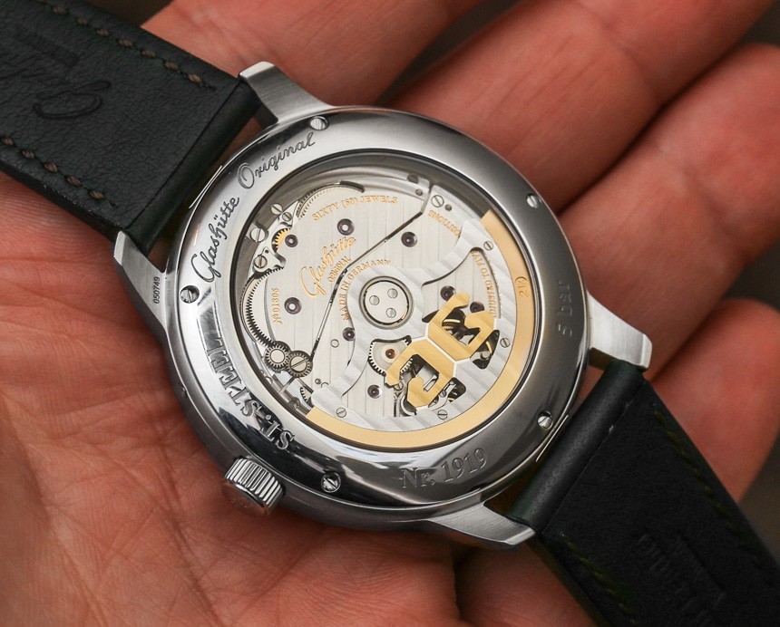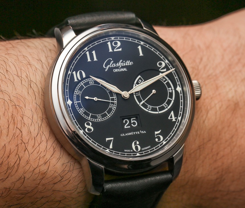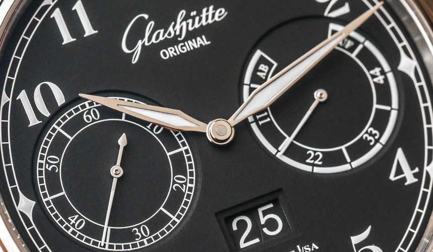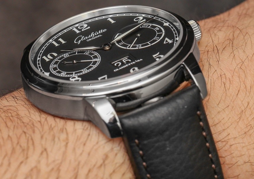 格拉蘇蒂原創 100-14 機芯是一款裝飾精美的自動機芯,以 4Hz(28,800 bph)的頻率運行,動力儲存為 55 小時。自動擺陀為 21k 金。它提供帶有輔助秒盤的時間、動力儲存指示器和大日期指示器(他們稱之為“全景日期”窗口)。我喜歡的是表盤功能的布局如何具有崇高的對稱性以及對易讀性的敏銳眼光。