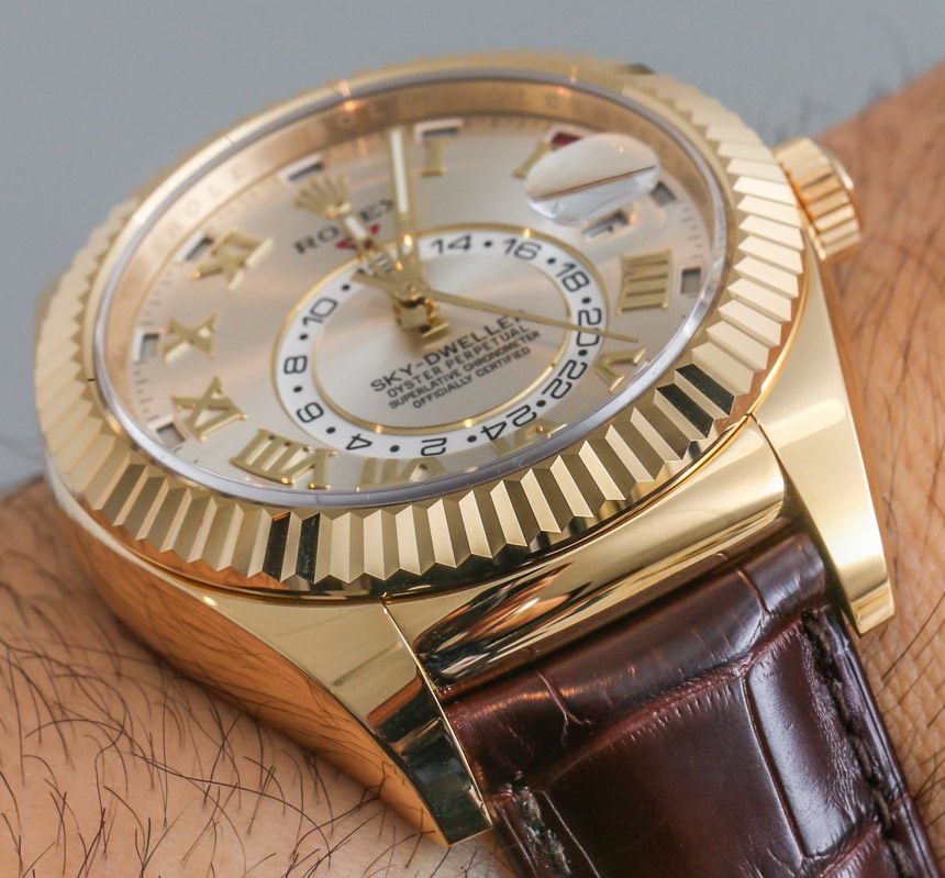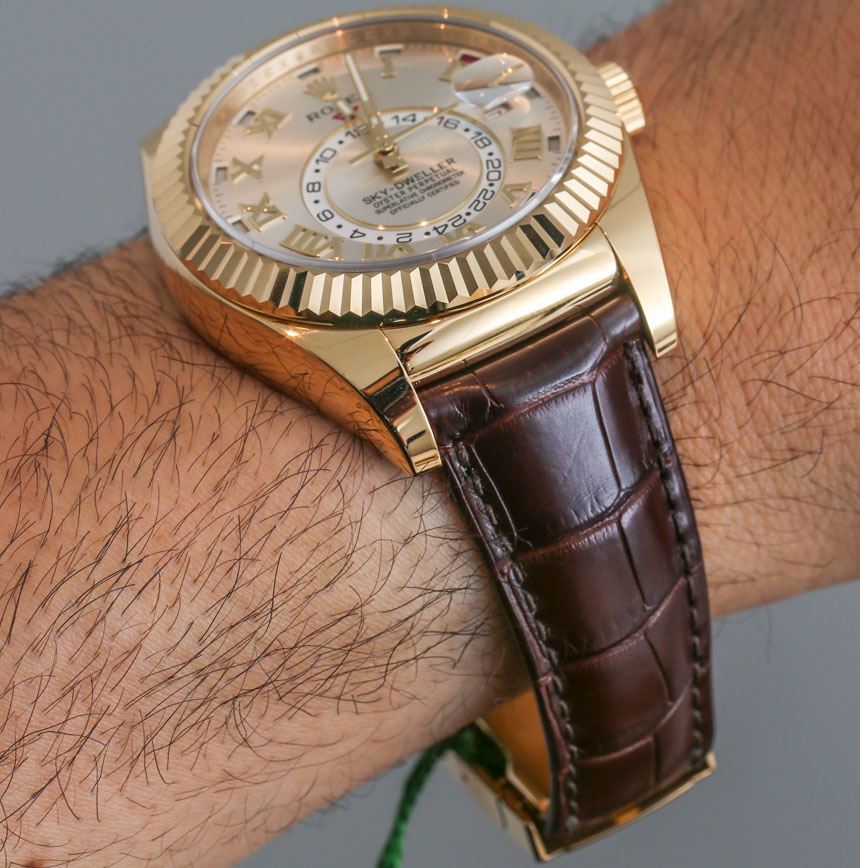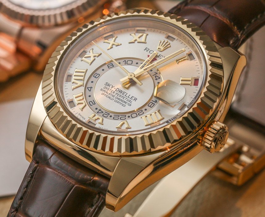 當勞力士首次推出勞力士 Sky-Dweller 時,它只有黃金材質——但有 18k 金、玫瑰金 (Everose) 和白金。2014 年,勞力士將腕表系列翻了一番,從三款增加到六款。仍然沒有任何新的材料選項,但有新的表盤樣式(本文中介紹的那些型號),以及表帶或手鐲的新選項。您會注意到,勞力士在表帶上提供勞力士 Sky-Dweller 的某些表盤版本,在配套的 18k 金手鏈上提供其他表盤版本。