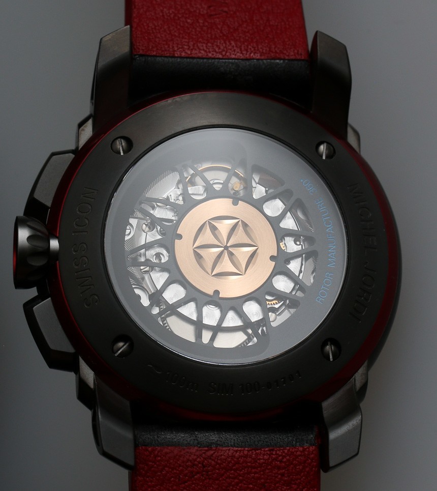 在 Jordi Chronograph Red Horizo??n 手表的背面,您會發(fā)現(xiàn)機芯上方有一個藍寶石水晶展示底蓋。手表使用的擺陀由 Jordi 內(nèi)部專門制造,看起來好像完全環(huán)繞整個機芯,而不是半圈。轉(zhuǎn)子大部分是黑色的,類似于車輪,而中心刻有漂亮的設計,看起來是未完成的黃銅。這是一個漂亮的轉(zhuǎn)子,盡管它背后似乎沒有任何明顯的主題。