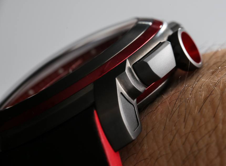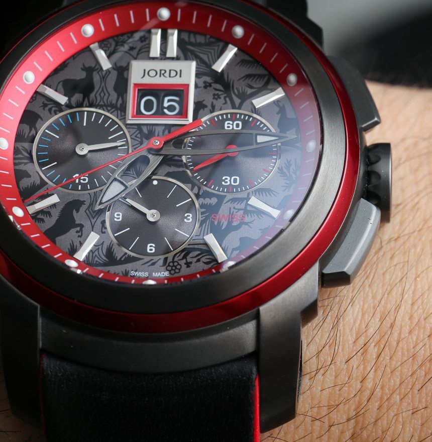 案例中元素的整合很有趣,而且大多是和諧的。任何佩戴 Jordi Chronograph Red Horizo??n 的人肯定會覺得它是一款非常不同類型的手表,但它與其他類似時計的表現(xiàn)差異不大。就其尺寸而言,由于主要采用鈦結(jié)構(gòu),表殼感覺很輕。該表殼的防水深度可達 100 米。