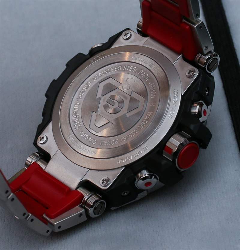 Casio G-Shock MT-G 外殼背面的那種三角形標(biāo)志是大多數(shù)高端 G-Shock 上使用的特殊符號(hào),稱(chēng)為“Triple G Resist”。這意味著手表特別能抵抗 1) 沖擊、2) 振動(dòng)和 3) 離心力(高速)。與大多數(shù)卡西歐 G-Shock 手表一樣,MT-G 手表防水深度達(dá) 200 米,作為高端 G-Shock 手表,它們具有鍍?cè)鐾改さ乃{(lán)寶石水晶。在手腕上,它們比 MR-G 手表大一點(diǎn),寬 53.5 毫米。它很大,但特殊(或多或少牢不可破)管狀樞軸上的完整鉸接式表耳非常適合讓手表牢固地抓住您的手腕。
