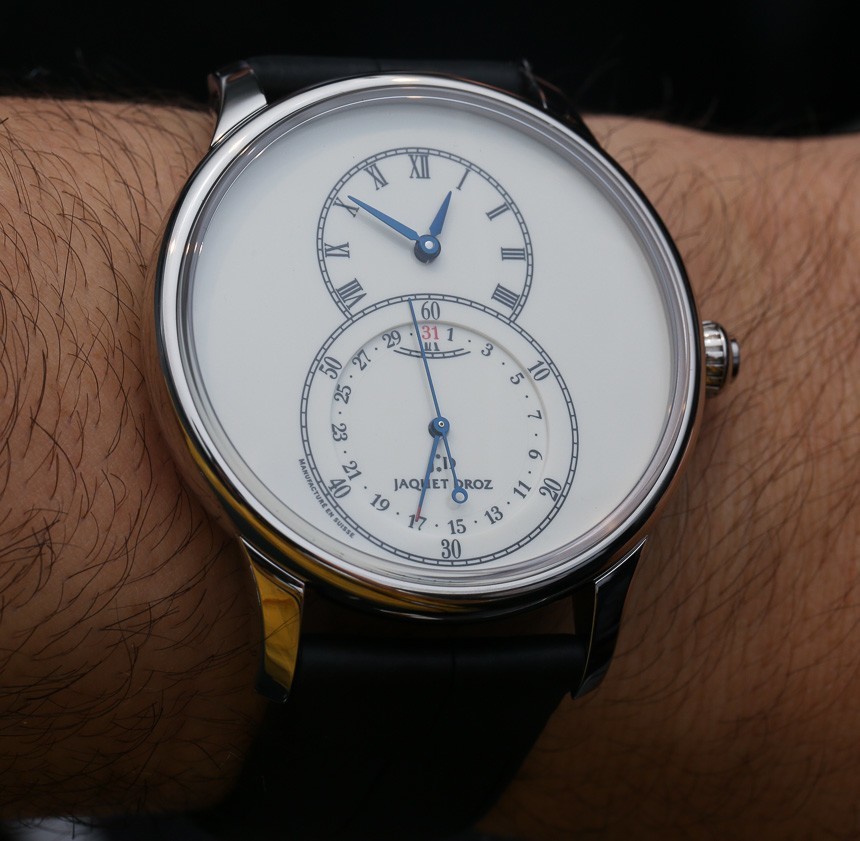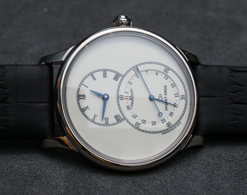 除了提供 18k 紅金或白金款式外,2014 年雅克德羅大秒針腕表還提供“象牙色琺瑯”表盤。雅克德羅 (Jaquet Droz) 喜歡將自己視為琺瑯表盤專家,的確,他們用限量版做了一些非常令人印象深刻的事情。這些手表提供更簡單但更吸引人的琺瑯彩繪和烘烤表盤,在象牙白色的表盤上提供清晰易讀的外觀。18k 紅金和白金版本均采用相同的象牙色表盤顏色。