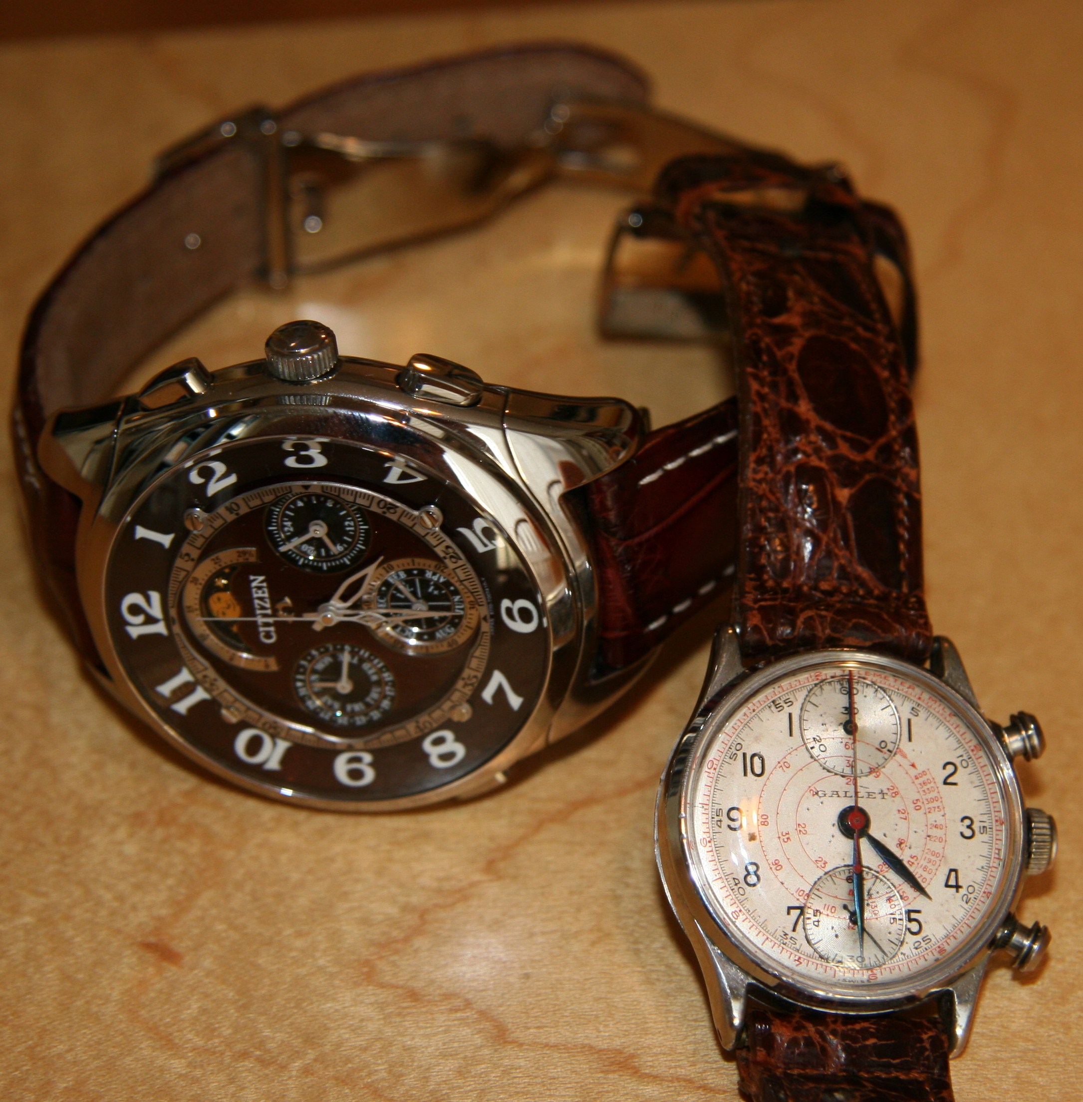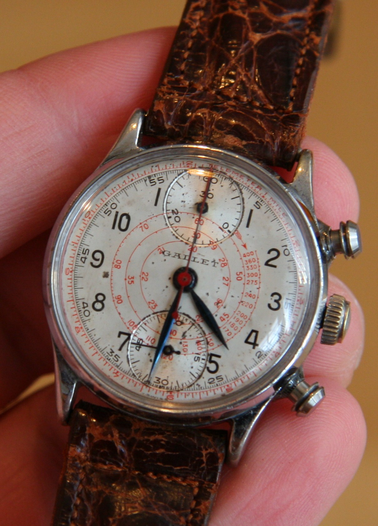 Gallet是一個瑞士品牌,已經存在了一段時間,可能已有近100年的歷史。他們目前正在努力重振品牌。因此,如果您從未聽說過它們,請不要感到難過。這可能是互聯網上唯一可以看到這款特定手表圖片的地方。Gallet曾一度銷售航空和軍用手表,因此它們更多的是功能性而非奢華傳統。盡管在這樣的時代,像這樣的功能性手表只保留給那些負擔得起的人,因為大多數為娛樂而飛行的人都不是一般人。巧合的是,哈里·杜魯門總統的一塊手表是與這款手表相似的Gallet Officer’s Chronograph,很可能是在同一時代制造的。因此,這是一款30分鐘計時碼表,帶有雙組合方向的輔助秒針表盤。另一個小表盤記錄用于計時分鐘。這款Gallet的罕見特征之一是小表盤的垂直方向(因為大多數都是水平方向)。其他外觀和功能相似的Gallet手表都有水平方向的小表盤,我從未見過像這種型號這樣的其他手表。小表盤的位置如此靠近表盤的邊緣,這一事實表明了機芯尺寸。緊湊性是一個賣點,這款手表的表殼實際上包裹著機芯。