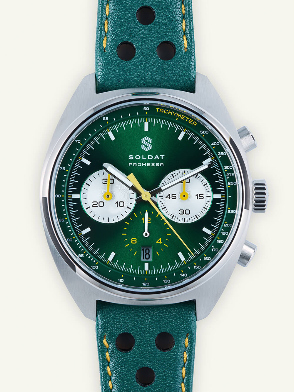 它還為令人驚嘆的表盤顏色留下了更多閃耀的空間。到目前為止,Promessa 系列共有三種變體:紅色彗星、綠色四十九和真藍。在這三者中,綠色絕對是贏家,尤其是黃色對比色縫合賽車表帶,讓人聯想到吉姆克拉克駕駛的著名蓮花 49 的制服。好吧,這款手表的造型源于經典;還不如從別人那里取色。