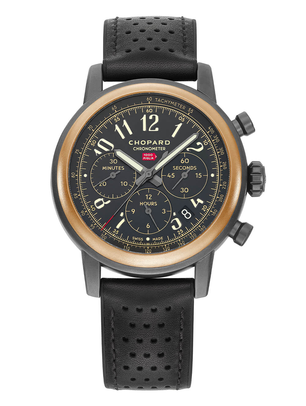 腕表搭載經天文臺認證的 4Hz 自動計時機芯,提供 42 小時動力儲備,這表明使用了 ETA 或 Sellita 機芯,Mille Miglia 腕表一直如此。機芯采用相配的青銅色裝飾,上鏈擺陀飾有日內瓦波紋,夾板飾有珍珠紋。
