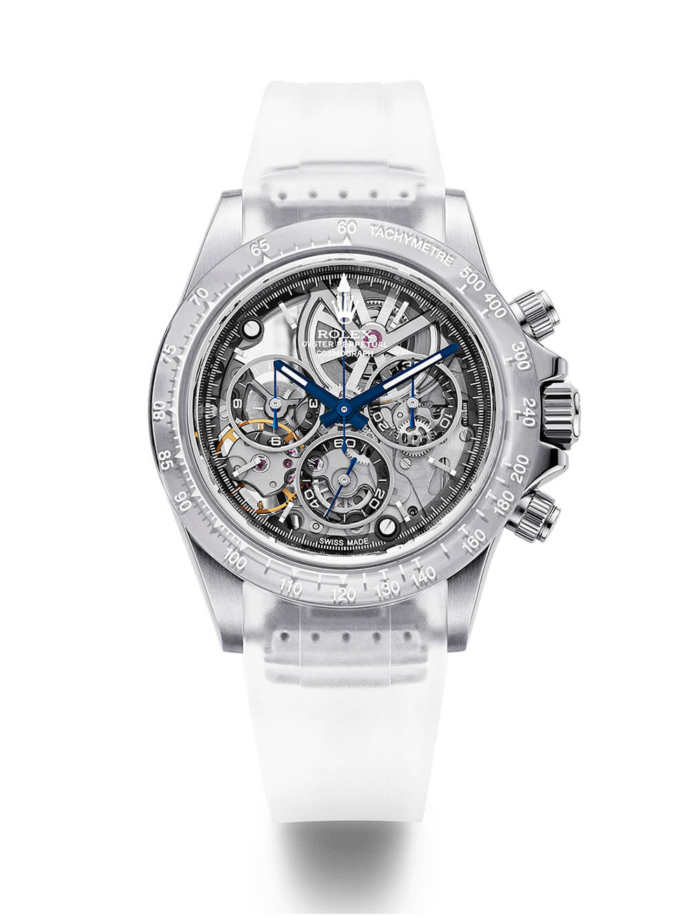 表殼在緞面不銹鋼材質(zhì)上更加精簡,但原始的 Daytona 按鈕被替換為 MK “Millerighe”版本,外觀和感覺更加堅(jiān)固,非常適合山區(qū)。整件事情都在透明橡膠表帶上完成,以使冰冷的外觀更加圓潤。