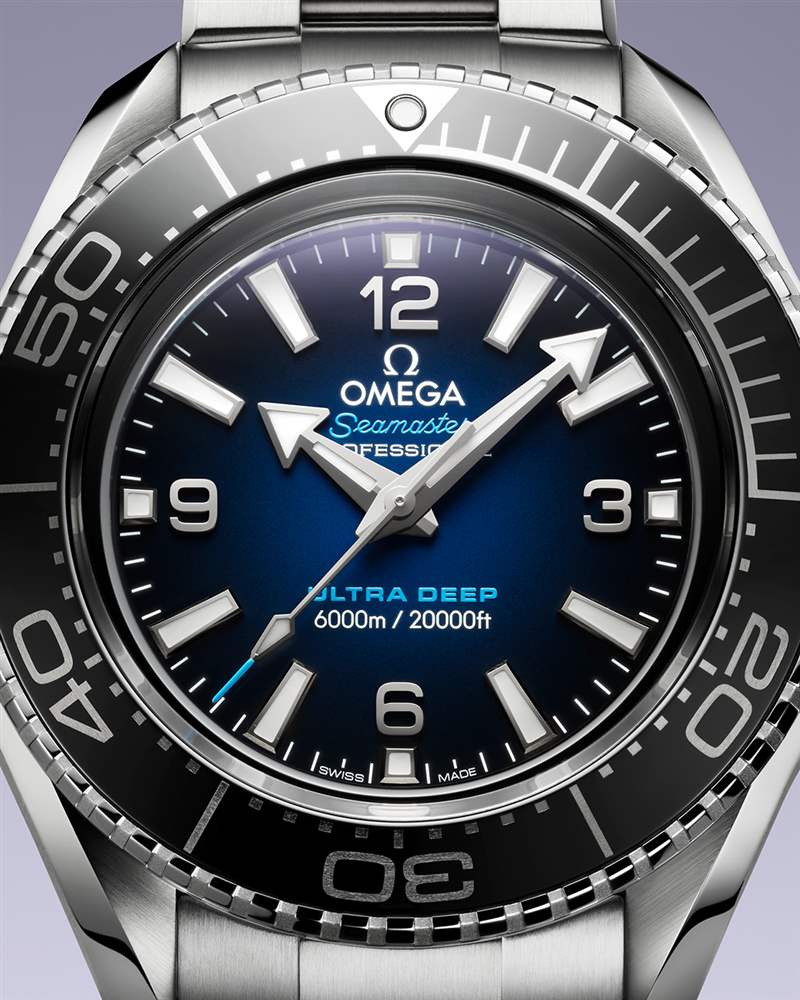 想深入漆黑的海洋深處探索海底的神秘,那么海洋宇宙腕表45.5毫米至臻天文臺 Ultra Deep 款堪稱專業潛水表的最頂端產品。這款腕表的表殼為45.5毫米,并不顯得很大,佩戴腕上頗為舒適。采用堅固耐用的 O-MEGASTEEL 材質打造,拋光黑色陶瓷表圈飾有 Liquidmetal 潛水刻度。透過凸起的拱型藍寶石玻璃表鏡,可以看到亮漆表盤呈現從藍色到黑色的漸變效果。最讓行家欣喜的是,在產品研發過程中,歐米茄在真實的海洋環境中對這款腕表進行測試,其防水深度高達6,000米(20,000英尺),并通過了國際標準化組織(ISO) 6425:2018有關飽和潛水表的認證,堪稱專業潛水表之王。
