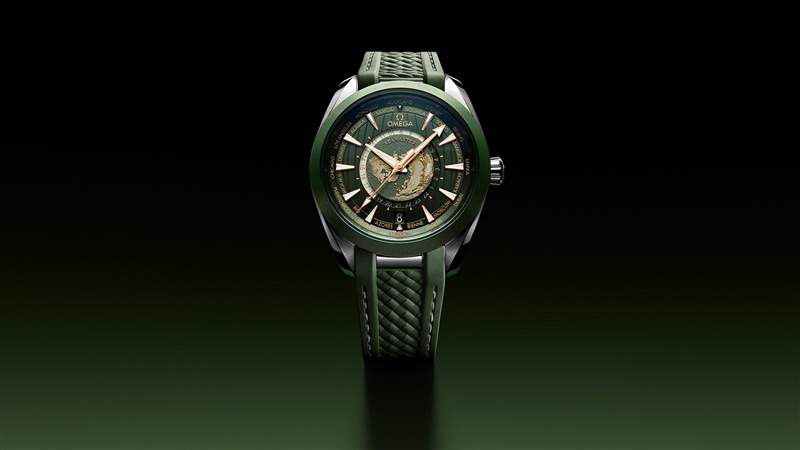 同樣出自海馬 AQUA TERRA 150米腕表系列旗下,43毫米至臻天文臺 GMT 世界時腕表其不銹鋼表殼搭配一體式綠色橡膠表帶,飾以灰色縫線,通過拋光鋼鏈節與表殼連為一體。最亮眼的綠色表盤呈現出太陽射線的打磨效果,搭配經過拋光和拉絲工藝處理的綠色陶瓷表圈。表盤中央設有內表盤,以激光燒蝕技術雕刻出從北極俯瞰的地球影像陸地輪廓與色彩。內表盤外側設有24小時刻度環,并區分指示夜晚和白天。表盤周圍環繞著世界各地的不同城市,所有地區名稱均采用金黃色,而英國首都倫敦則采用紅色,對于環球的旅行家來說使用起來方便快捷。
