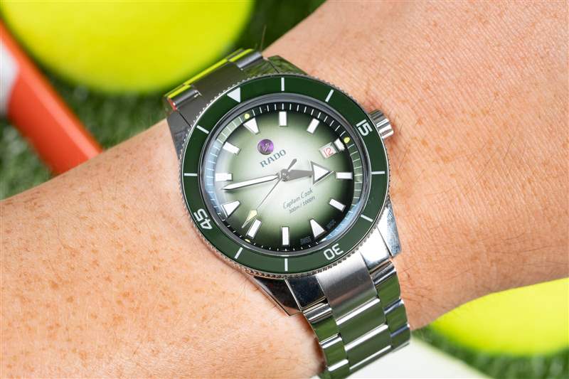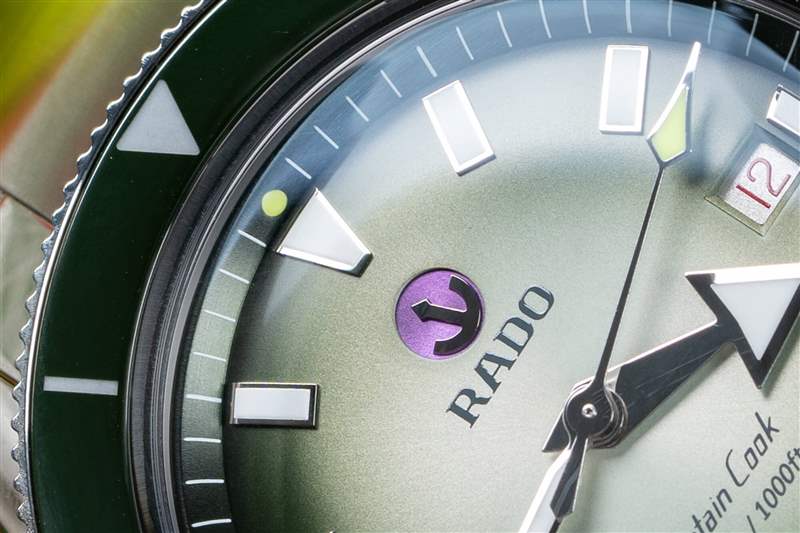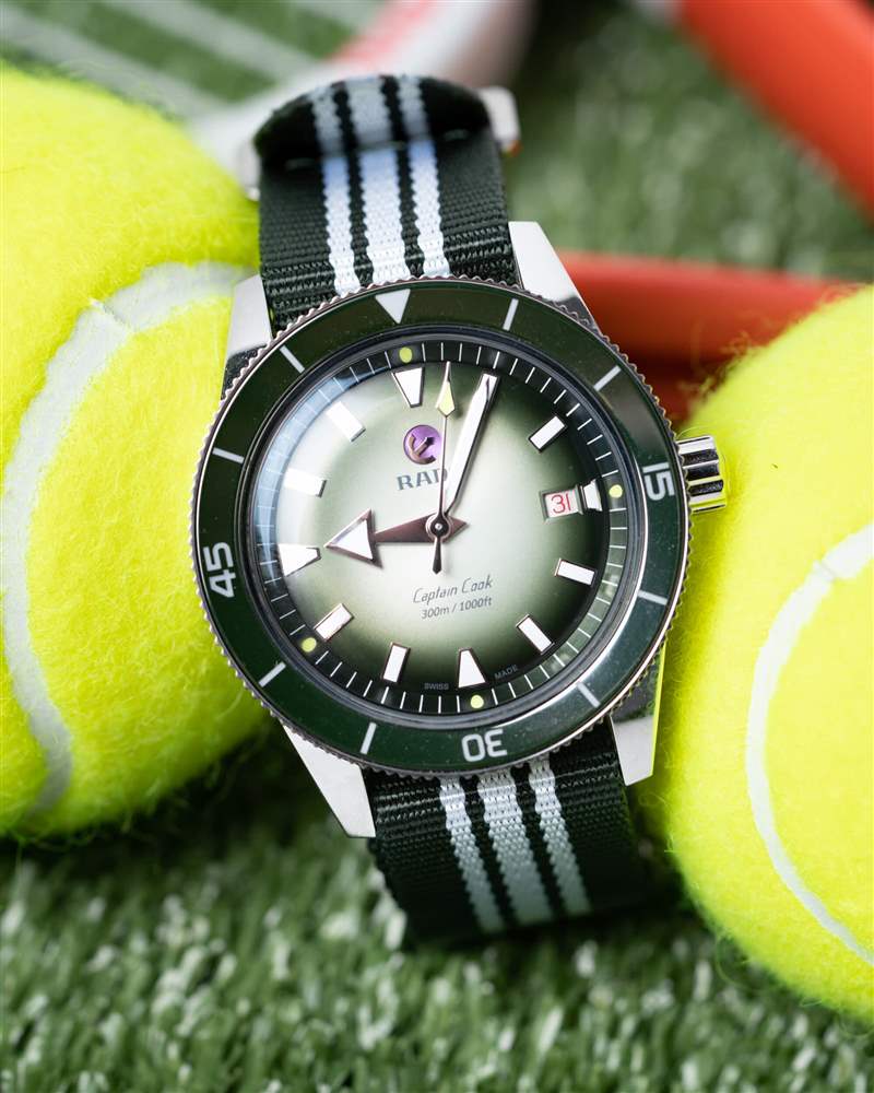卡梅倫·諾里 (Cameron Norrie) 庫克船長 (Captain Cook) 的表盤是這一切的集大成者。這就是 Norrie 和 Rado 享受樂趣的地方。您擁有標準的大箭頭時針(加上網球黃色秒針尖端)和所有庫克船長腕表上都有的應用標記,以及相同的表盤文字和精美的紅色文字日期輪。這一切都很棒,您不會聽到我對 Super-LumiNova 的易讀性和亮度提出任何抱怨。Norrie 版本將北約 (NATO) 的白色和綠色圖案與表圈融為一體,引入了從白到綠的漸變,最終形成深綠色的章環。