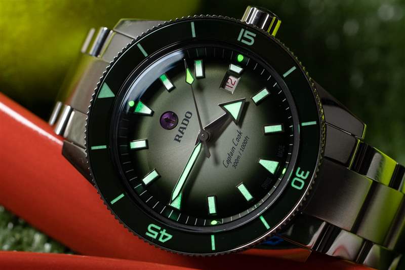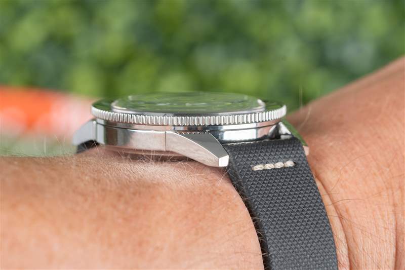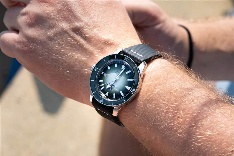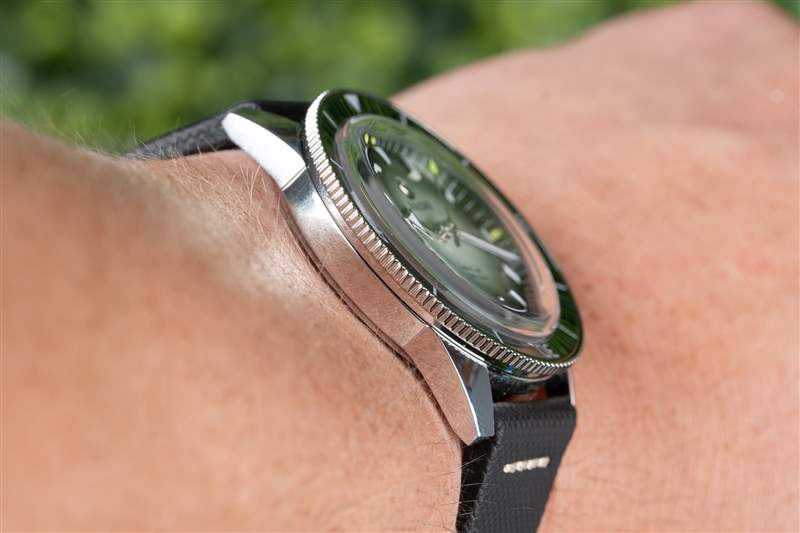 庫克船長系列的標志是其體育場表圈。硬幣邊緣經過完全拋光,綠色陶瓷嵌件也是如此,其上刻有 Super-LumiNova 填充標記。與扁平邊框類似,但外觀更酷,這種風格最大化了握持面積,同時最小化了高度,而更常見的凸形邊框通常會導致更高的高度或更少的握持力??梢钥隙ǖ氖?,卡梅倫諾里庫克船長通過了我嚴格的表圈測試:當我的手和表圈都是濕的時(在我兒子洗澡時和在海里時),我能夠旋轉它。高度的比例優勢也很明顯,腕表厚度為 12.3 毫米,佩戴起來非常舒適,尤其是對于 42 毫米、300 m WR 腕表而言。雖然它不是瑞士 300m 跳水運動員中最瘦的,但它擊敗了歐米茄海馬和勞力士潛航者,前者的表圈在潮濕時毫無用處。