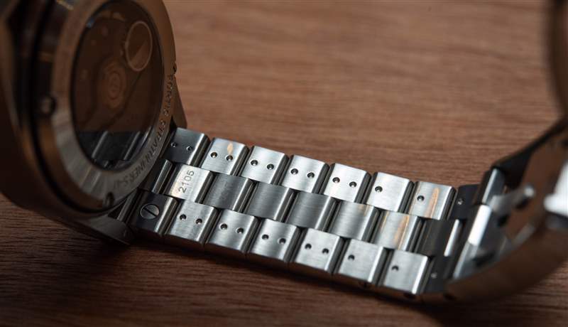 41 毫米寬的表殼采用再生不銹鋼制成,在金屬中觀看時最能欣賞到美感。塊狀表耳以強烈的曲線打造出平流層的輪廓,配有兩個倒置的按鈕和被橡膠條分成兩半的表圈。就像表盤一樣,表殼乍一看也很簡單——可以說太簡單了,但這種設計會通過長時間的佩戴展現出經過深思熟慮的新細節。表殼和表鏈感覺可以使用很長時間——不僅僅是因為它們的塊狀設計,還因為它們的貼合度和表面處理。一個典型的例子是帶有三個墊圈的旋入式表冠,按鈕的精確配合保證了 200m(660ft)的防水性能,這適合在真正的手表愛好者的監督下制造的手表。