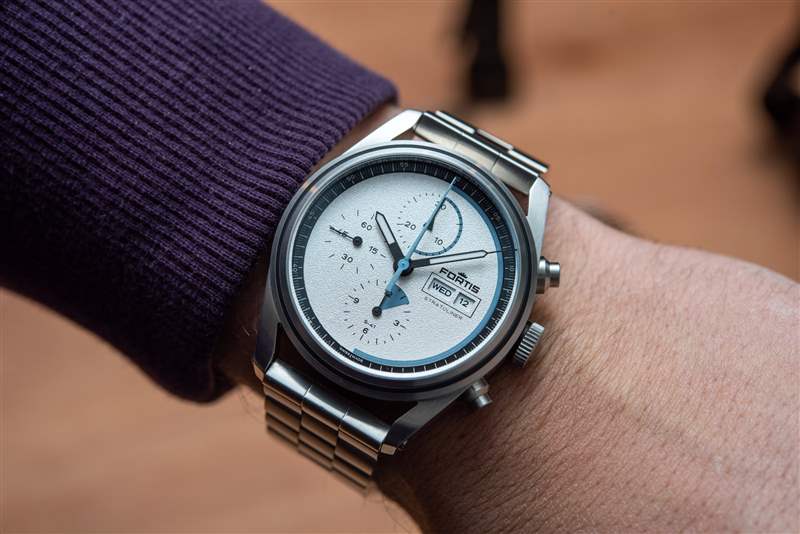 Stratoliner 有多種表盤組合可供選擇,就連貫性和獨特性的理想融合而言,極地白色和藍色表盤可能是其中最好的。Fortis 為其表盤的纖薄而感到自豪,而且小表盤是平坦的,而不是凹陷的;日期和星期顯示都比平常更清晰,更靠近水晶。指針大而易讀,具有強烈的夜光和黑色輪廓,注射器式分針以精致的刻度準確地指示分鐘。雖然繁忙的秒針刻度非常適合準確讀取計時秒針,但它使分鐘的讀取變得復雜。由于每隔五個位置沒有一個大的時標,因此以分鐘的精度報時需要一些時間來適應。