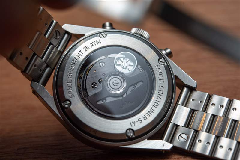 Fortis Stratoliner 的一切都采用迷人的日耳曼風格,從單個表帶鏈節到雙層表帶,都很粗壯,但并不笨重。可以肯定的是,它不是手腕上的卡地亞 Tank,但這里的目標人群顯然是在追求一款設計精致、堅固耐用的包。坦率地說,這是一款想要獲得太空認證的手表的先決條件。