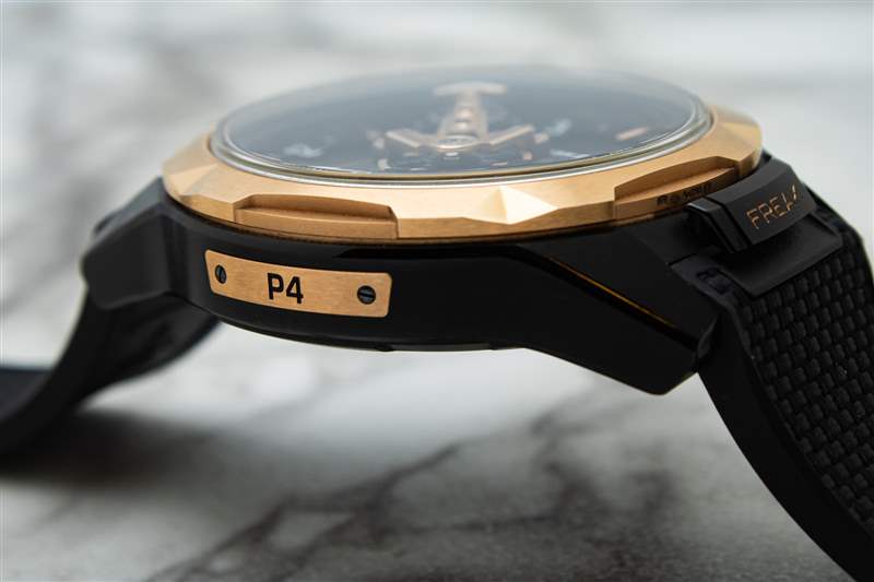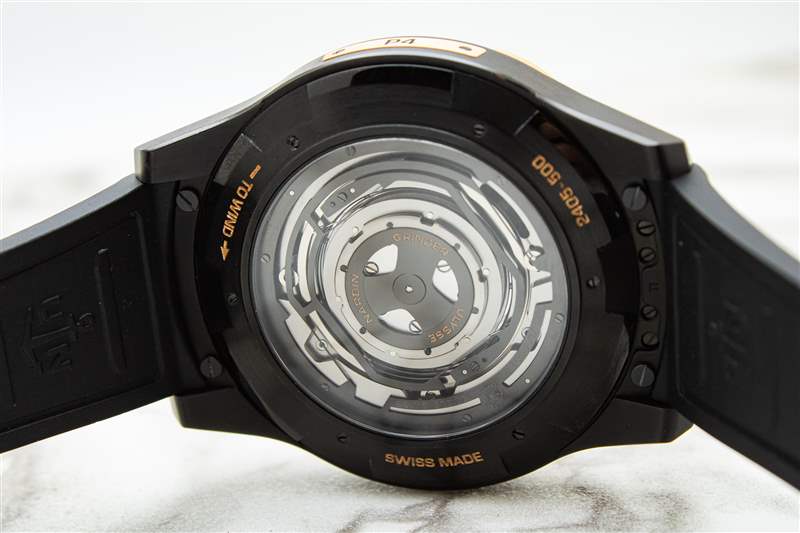 當然,實際上 Freak ONE 并沒有什么平庸之處,仔細觀察紅金表圈就可以立即看出這一點。基于這種拉絲和拋光元件中尖銳的刻面圖案,這個表圈可能看起來不對齊,但這是 Freak ONE 獨特的上鏈和時間設置系統的唯一真正的視覺線索。翻轉 6 點鐘位置的“Freak”牌,旋轉表圈就會解鎖,但旋轉的不僅僅是表圈本身。扭轉這個雙向表圈還可以向前和向后調整時間設置,為佩戴者提供與 Freak ONE 啟動對話的齒輪系的大規模觸覺連接。在背面,藍寶石顯示屏底蓋同樣非正統。通過逆時針旋轉底蓋外環,佩戴者可以手動為機芯上弦,盡管 Freak ONE 的創新上鏈系統使得這一點基本上沒有必要(稍后會詳細介紹)。雖然 Freak ONE 的外殼非常耐磨,而且充滿了有趣的花招,但它的致命弱點就是防水。這是該手表日常佩戴理念面臨的最大障礙,因為 30 米的深度等級讓 Freak ONE 根本無法勝任許多運動場合的任務。