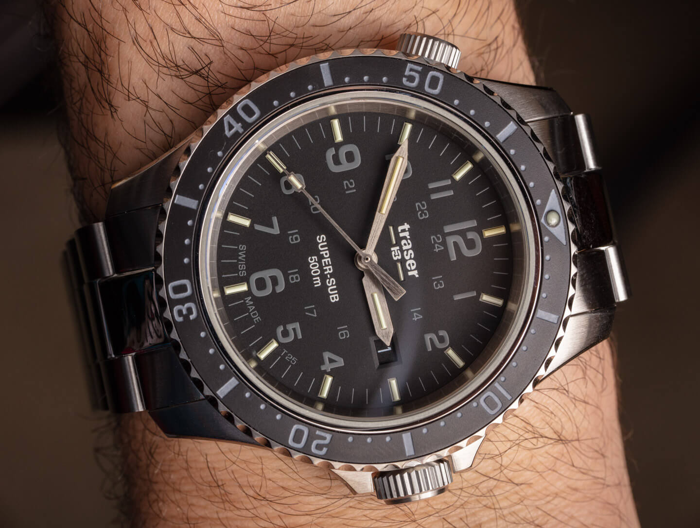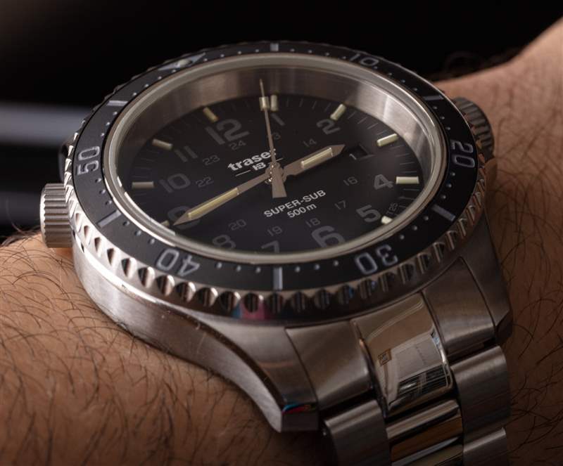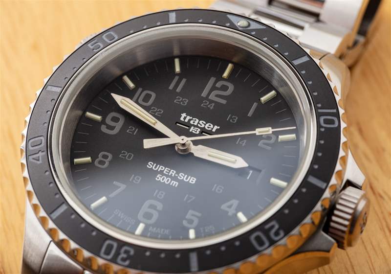 P67 SuperSub T100 型號使用較粗的扁平氣管作為時標。此處的照片代表 T25 參考 109378 P67 SuperSub 手表。確實,它在黑暗中不如 T100 型號那么亮,但在我看來,它在視覺上也更具吸引力,可以更好地日常佩戴。這是黑色表盤表款,搭配相配的精鋼表鏈。Traser 還生產帶有橙色或藍色表盤的 P67。確實,手有點短,但易讀性仍然很好。我的懷疑是由于手的重量,手的長度沒有達到應有的長度。P67 SuperSub 系列使用瑞士制造的 Ronda 石英機芯,在更傳統的機械機芯中,這種機芯的指針并沒有盡可能重。