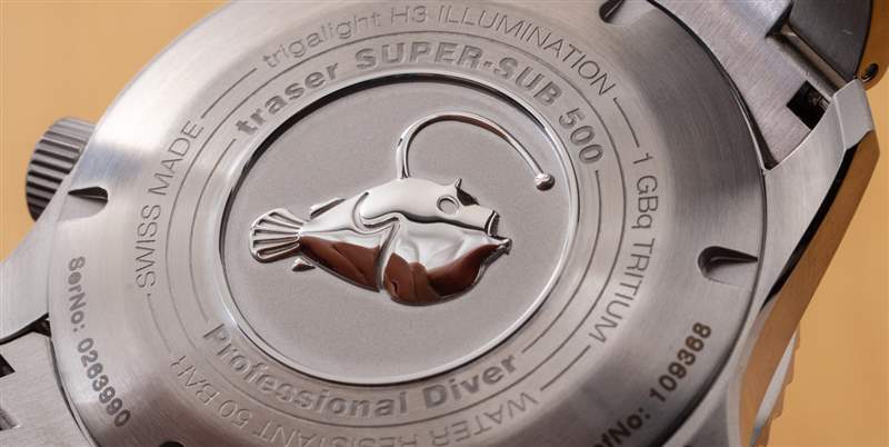 表迷們會感嘆 P67 SuperSub 沒有機械機芯,但 Traser 很容易反駁,提醒人們對于許多應用來說,精確的石英計時比機械機芯更有效。大多數 Traser 手表實際上是石英的,盡管該品牌確實提供機械型號(請參閱此處的 Traser P66 Automatic Pro 的 aBlogtoWatch 評論)。表殼背面是琵琶魚的圖案(原因很明顯,因為該生物具有天然的生物發光特性)。