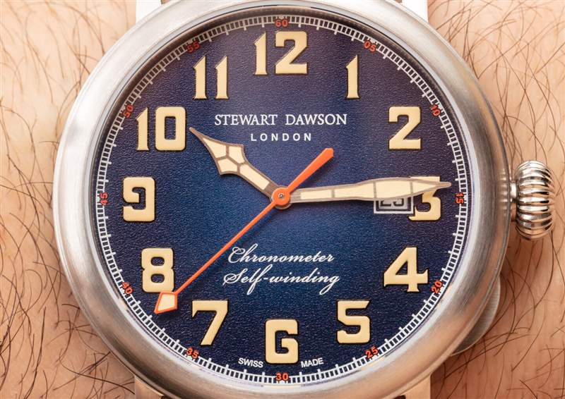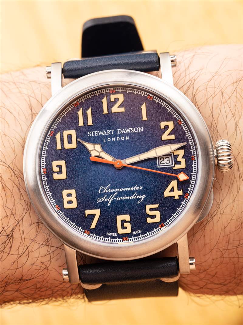 斯圖爾特道森的外觀并不太寒酸。至暗時刻共有三種表盤顏色,這是 REF。1940.A.SS.DH02 – 藍色(藍色表盤和配套表帶)。發光體涂得足夠厚,可以稍微抬高一點,顏色是一種有吸引力的“老化”奶油。它實際上比純白色更漂亮,更有吸引力。表盤上的日期窗口并沒有太大幫助,但除此之外,顏色、紋理和字體的混合對整體外觀來說效果很好。從時尚的角度來看,斯圖爾特道森獲得的不僅僅是及格分數。