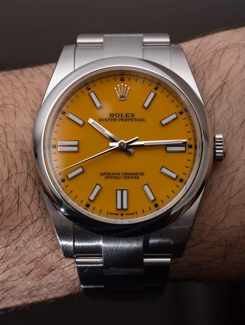 勞力士還生產其他較小尺寸的 2020 Oyster Perpetual(例如 36 毫米寬到更小的女式尺寸);大多數 Oyster Perpetual 型號還配備珊瑚紅色和黃色表盤選項。對我來說,如果我必須在這兩者之間進行選擇,我認為黃色表盤 124300 Rolex Oyster Perpetual 41 是我的選擇,但我可能很樂意穿任何一個。
