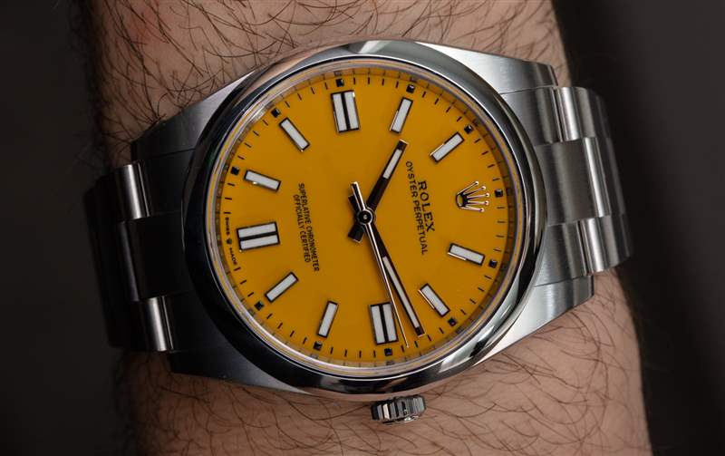 與紅色 Oyster Perpetual 表盤一樣,勞力士網站上的黃色表盤并不能完美地代表實際黃色表盤的外觀。實際的黃色表盤要輕一些,但只是輕微的。然而,在我看來,勞力士網站上的黃色比珊瑚紅要好得多——所以,你看到的顏色接近 Oyster Perpetual 41 表盤上的實際顏色。更重要的是,雖然珊瑚紅在顏色上更注重時尚,但黃色確實讓人感覺這兩種選擇中更具運動感——盡管對于那些想要勞力士腕表體驗而不想要傳統保守風格的人來說,這兩種選擇都是非常有吸引力的選擇來自目前周圍的大多數勞力士時計。